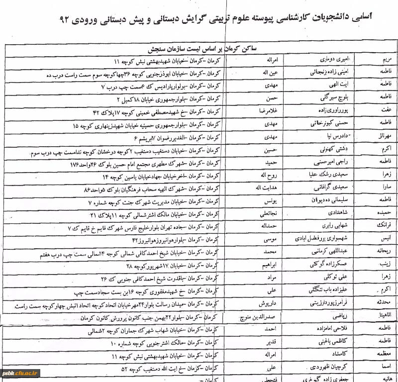 اسامی دانشجویان انتقالی از پردیس زاهدان به پردیس شهید باهنر کرمان